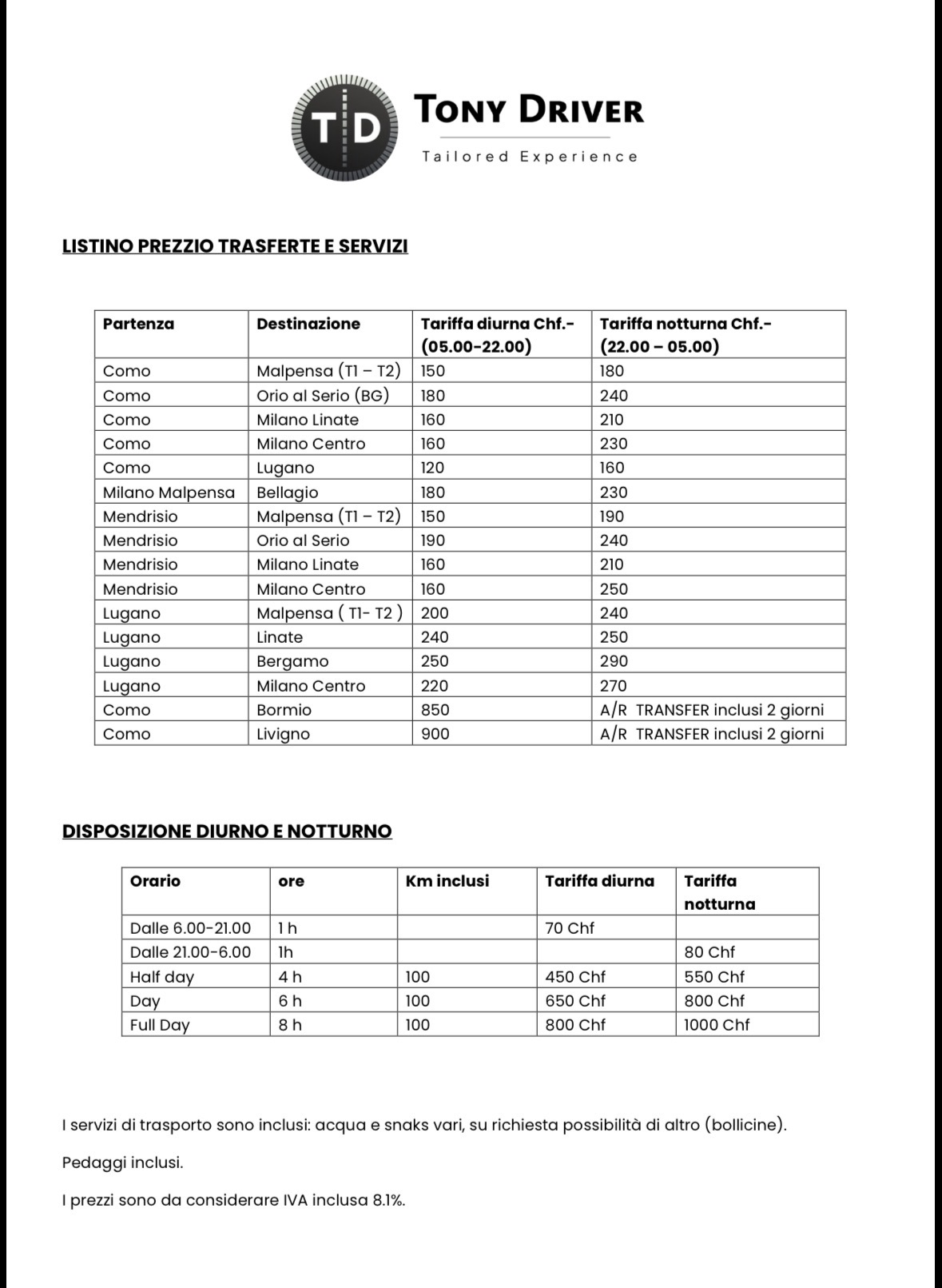 Goditi il viaggio senza pensieri con il trasferimento privato 24 ore su 24, per un massimo di 6 persone. La partenza dalla Svizzera è prevista il venerdì alle ore 20:00 e il rientro la domenica alle ore 20:00, con un servizio personalizzato e discreto firmato Tony Driver.
